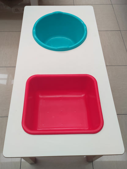 Mesa con dos compartimientos para recipientes plásticos, en el cual niños y niñas desarrollan la exploración con agua, arena o diferentes materiales, potenciando la creatividad y el juego en grupo.