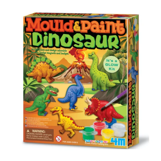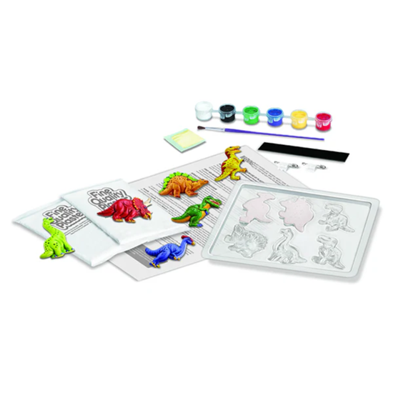 Es un juego de manualidades donde podrán hacer sus propios imanes o prendedores de dinosaurios, utilizando los moldes, el yeso y las pinturas que se incluyen en el kit.