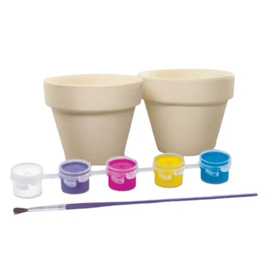 Incluye 2 macetas de terracota (unos 6 cm), 1 tira de pintura ( 5 colores) y 1 pincel.